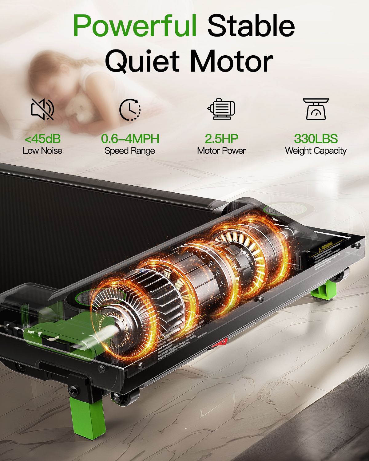 3, Powerful Stable And Quiet Motor: The AKLUER desk treadmill equipped with an upgraded 2.5HP motor that delivers powerful and quiet performance, emitting less than 45dB of noise, providing a smooth and seamless running experience even at high speeds. With a speed range from 1-6km/h, you can freely switch between walking and running to meet your different exercise needs, with a maximum weight capacity of 150kgs, ensuring your satisfaction during workouts.