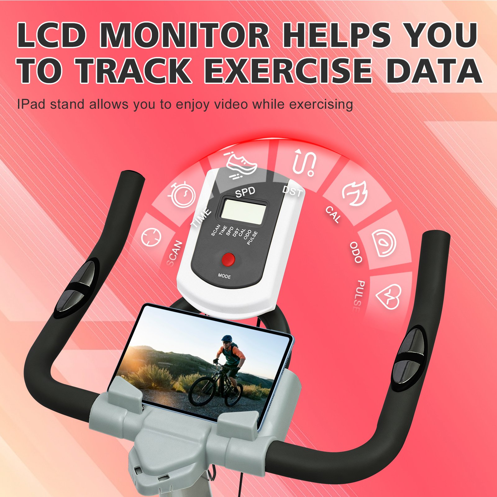 [STURDY AND DURABLE] The exercise bike's heavy-duty steel frame and 30-pound flywheel ensure stability while riding. The belt drive system provides a smooth, quiet ride that won't disturb other members of the room.