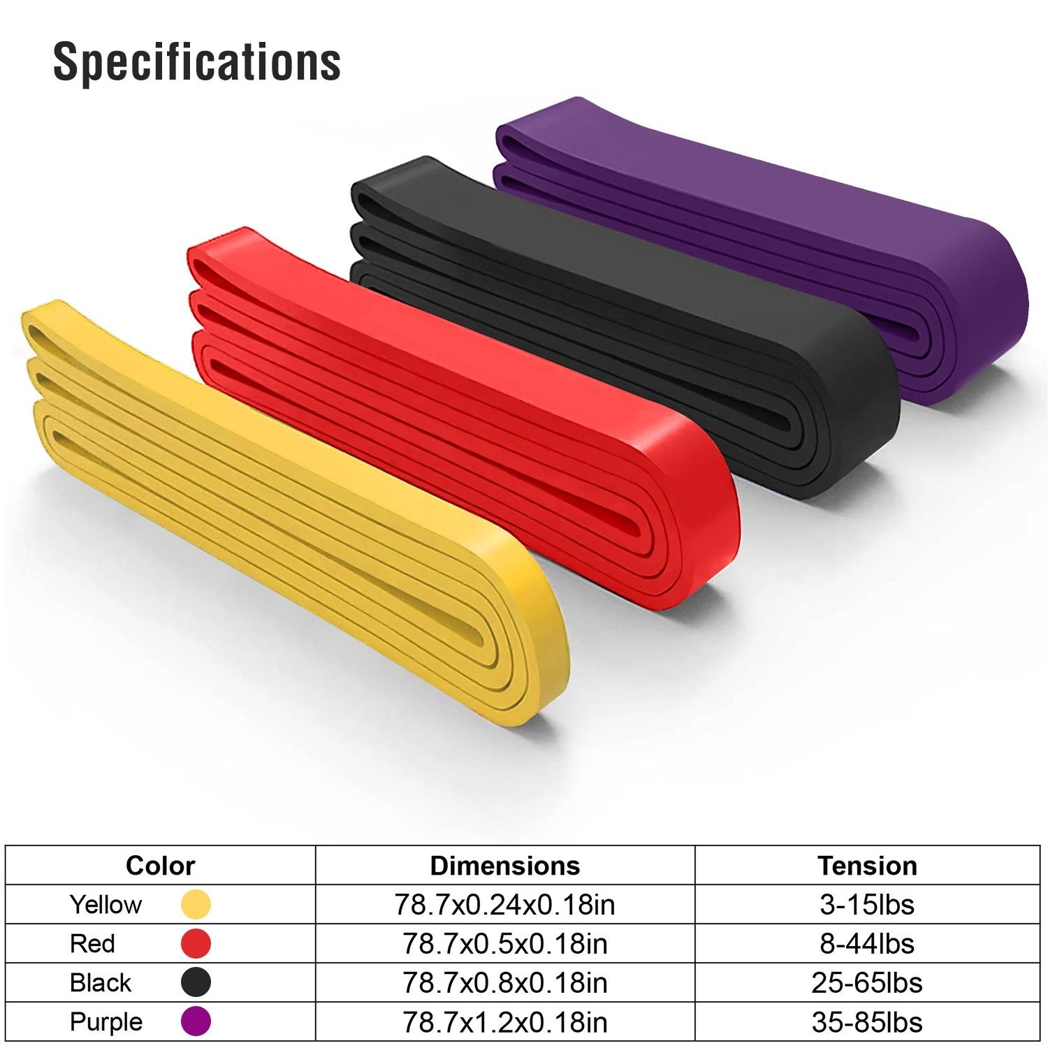 *4 Various Strength Levels*:A variety of bands allow you to do more trainings. Yellow(3-15lbs):Suitable for rehabilitation. Red(8-44lbs):suitable for speed barbell training; shoulder mobility; and rehabilitation. Black(25-65lbs):suitable for medium tension for resistance training and pull up assist. Purple(35-85lbs):ideal for pull up assist; stretching; power lifting; and advanced banded barbell training.